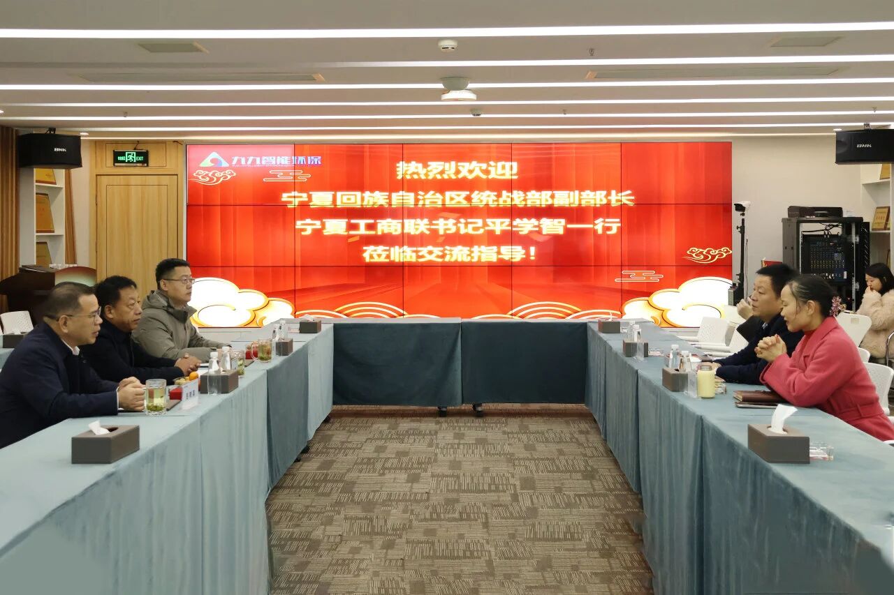 12月24日,寧夏回族自治區(qū)統(tǒng)戰(zhàn)部副部長、工商聯(lián)黨組書記平學(xué)智,寧夏回族自治區(qū)工商聯(lián)組織和商會(huì)處處長王紅忠,寧夏湖南商會(huì)會(huì)長彭樹其一行蒞臨九九智能環(huán)??疾旖涣鳌9径麻L劉黎明、總經(jīng)理劉淑芳熱情接待,并陪同參觀講解。
